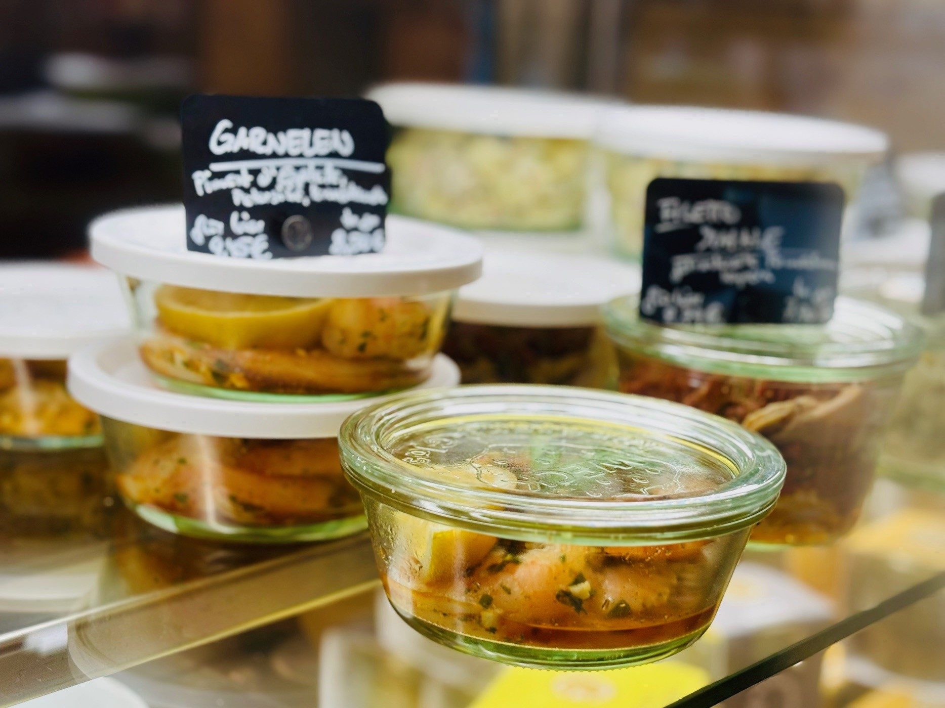 Deshalb gibt es bei uns Speisen im Glas. Nur noch warm machen und genießen! Außerdem unsere wöchentlich wechselnden Salate und Desserts. Zum Essen bei uns im Deli oder eben auch für zu Hause. Immer fünf kalte Speisen und drei Desserts.