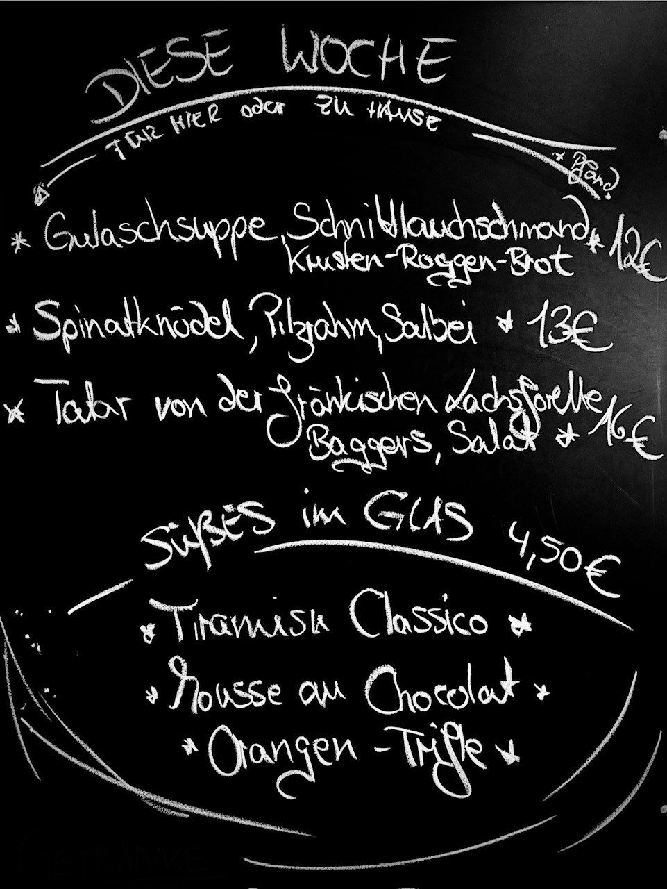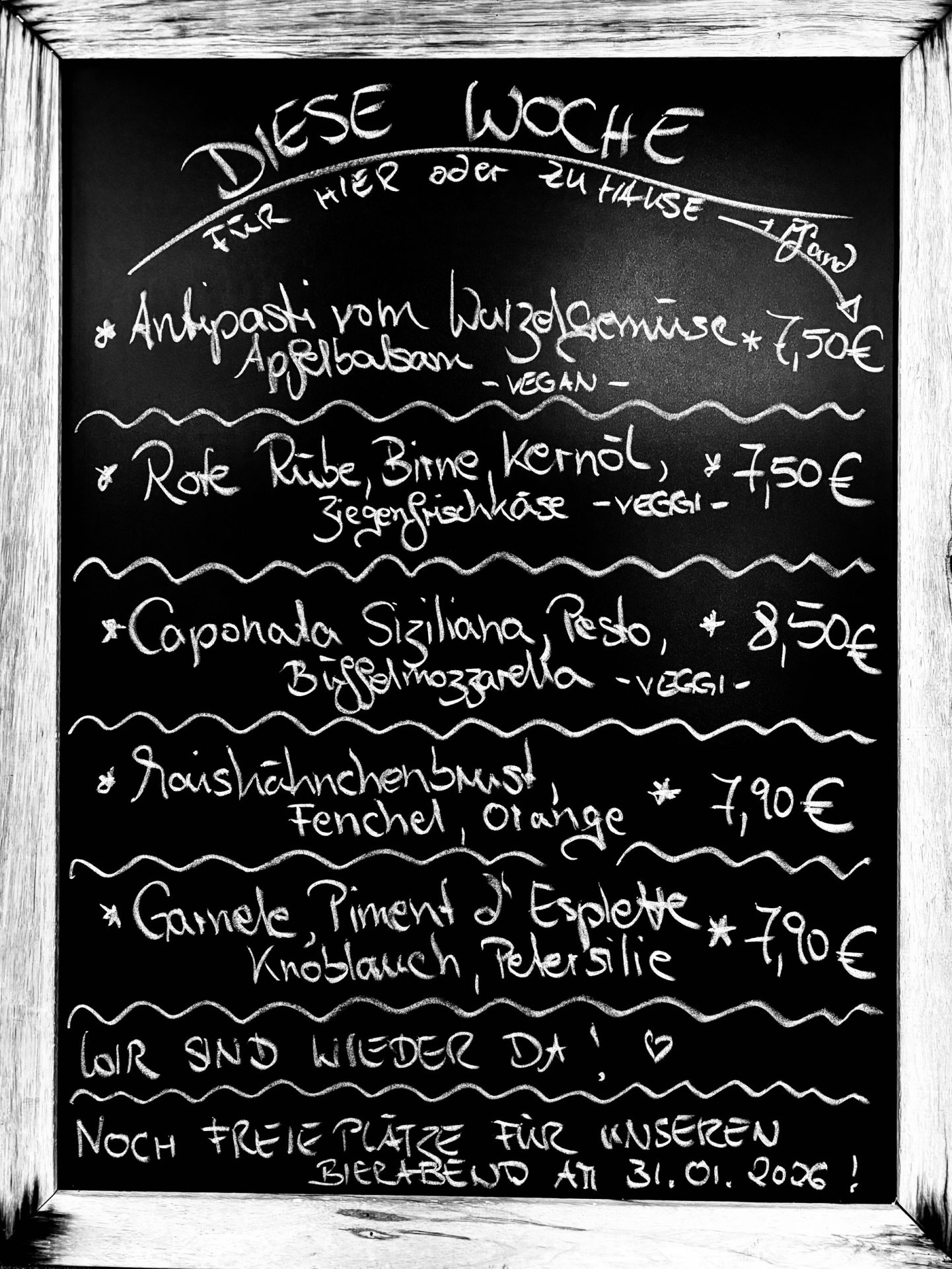 Diese Woche zum Essen bei uns oder zum Mitnehmen (zzgl. Pfand) aus Küche, Theke und Vitrine: